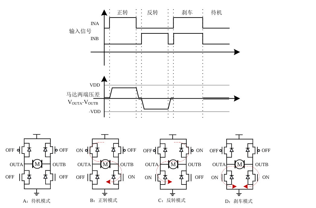 定义理想波形:首先在时序图上画出目标波形,明确正转、刹车、反转三种状态的时序关系,以及对应的H桥开关管(A、B路)逻辑电平。
