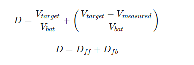 Dfb=(Vtarget−Vmeasured)/Vbat: 这是反馈项。它根据当前电压误差 (V_target - V_measured) 进行一个固定比例(比例系数为 1/Vbat)的修正。当实测电压低于目标时,此项为正,增加占空比;反之则减少。